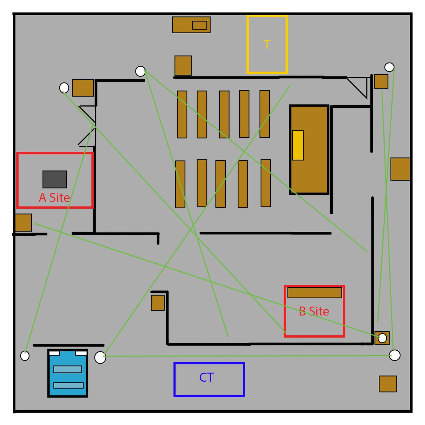 The sketch I drew in class remains, however. Analysing site locations, sight lines, spacing and cover, potential grenade hotspots... Grenades are the big thing, especially in a professional match, which meant the entire map had to be scaled larger, and I was considering putting in higher walls and other objects to catch grenades from being thrown too far and too precisely (but decided against it, as I would simply balance them on a case-by-case basis to reward player knowledge). I ran simulations with bot players, and had a couple friends give feedback on balancing, and found that it's actually pretty balanced between the teams, at least at a casual level. I learned a lot and had heaps of fun, it's just a shame not many got to play it.
